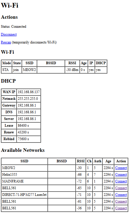 A simple management interface is available at h t t p://192.168.1.1/wifi. It uses a very basic HTML page designed to work with virtually any web browser. From there you can view the connection status, see what networks are available and attempt to connect. As this is the Pico doing the connection this of course can be any 802.11/b/g/n 2.4GHz network WPA/WPA2/WPA3 regardless what your computer/os is aware of.